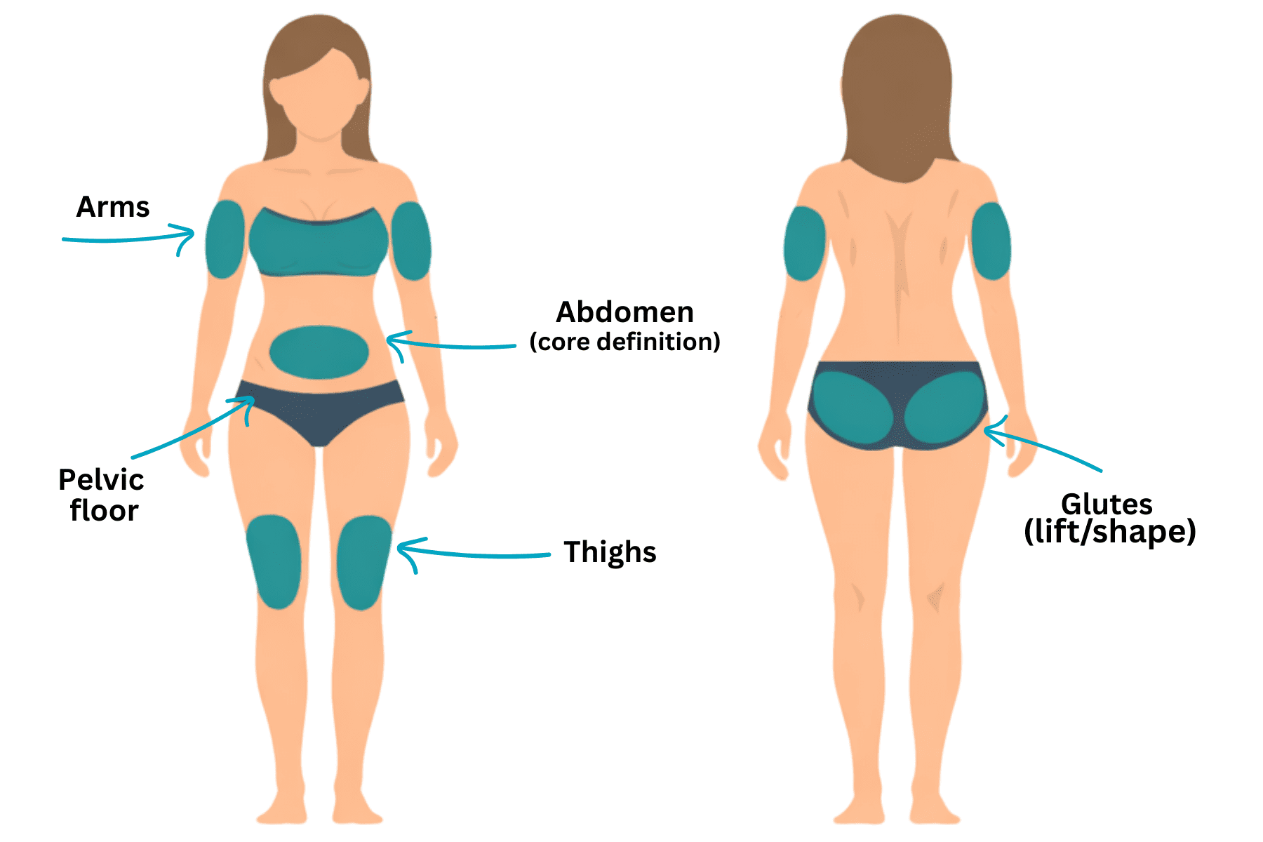 A: Common areas include abs, glutes, thighs, and upper arms. Pelvic floor stimulation may be available for select candidates depending on the pad/applicator and screening.